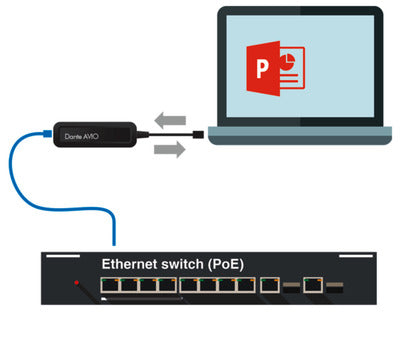 Function: Connects a computer or compatible device directly to a Dante® audio network, providing 2-channel recording (In) and 2-channel playback (Out) capabilities over the network.