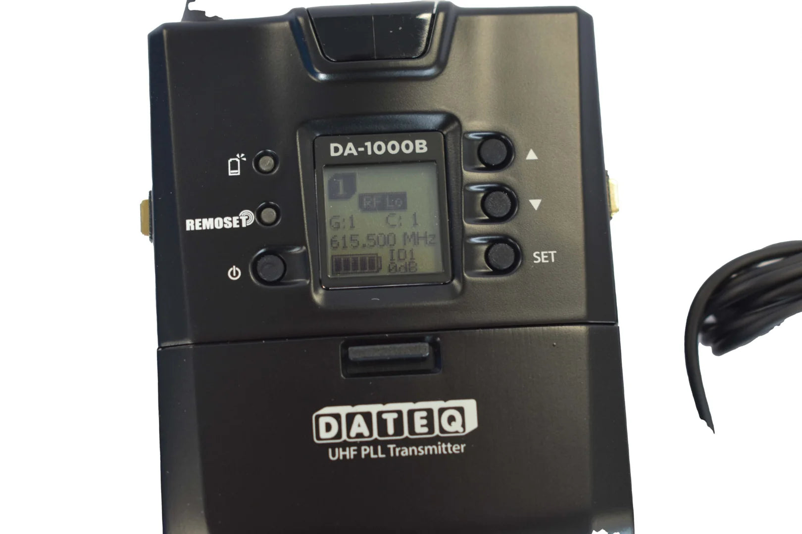 The DATEQ DA-1000B/6 is a professional UHF PLL diversity beltpack transmitter from the 1000 Series wireless microphone system. It is designed to offer maximum flexibility and reliability for various professional audio applications, especially when combined with headset, lavalier, or musical instrument microphones.