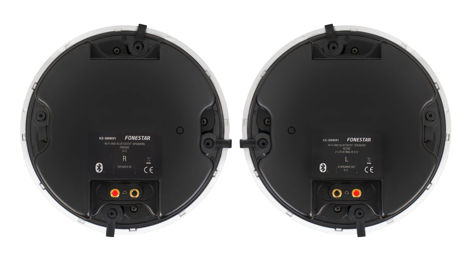 The Fonestar KS-08WIFI is a premium, all-in-one ceiling speaker sound kit that features both Wi-Fi and Bluetooth connectivity, making it ideal for streaming high-quality music in modern residential or commercial settings. It consists of one active speaker with an integrated amplifier and one passive speaker.