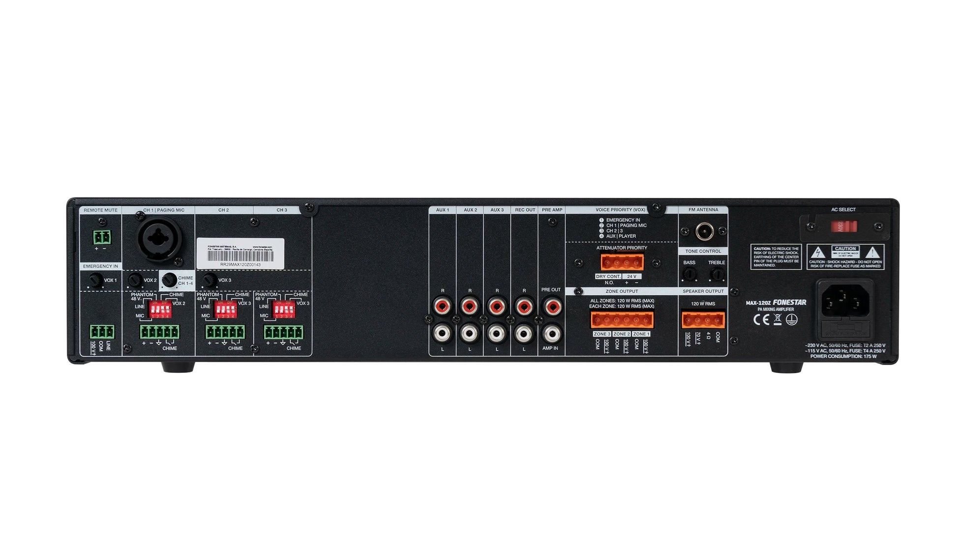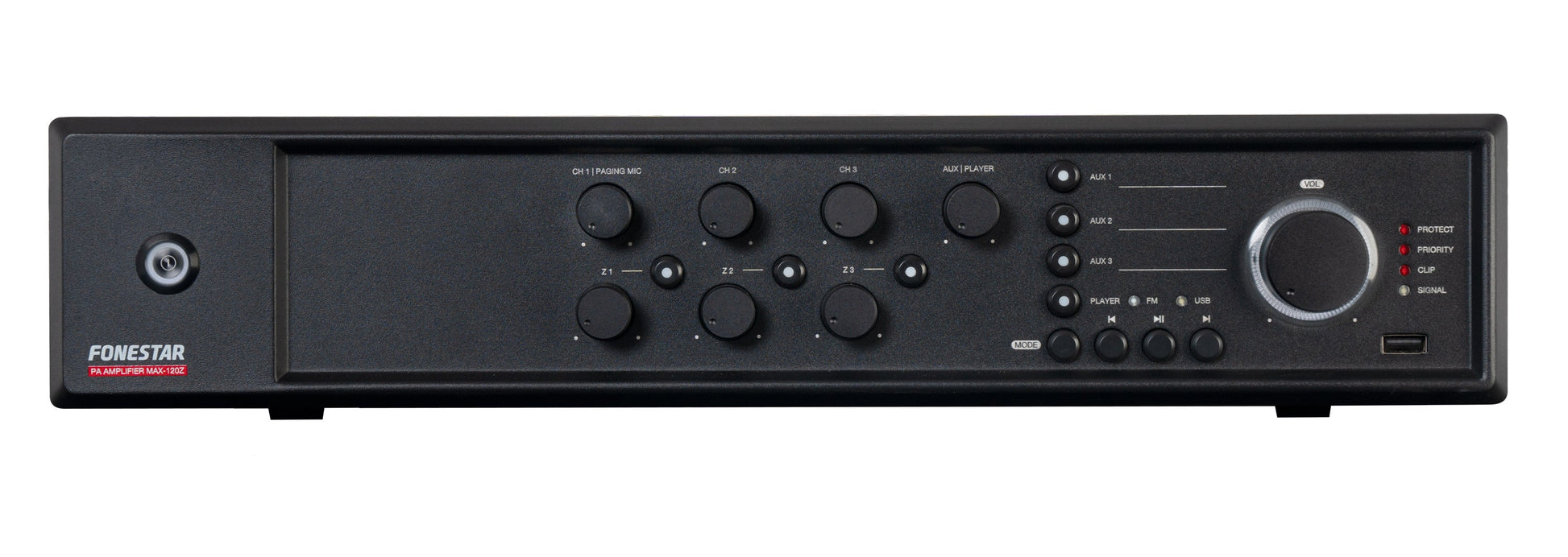 The Fonestar MAX-120Z is an integrated and compact Public Address (PA) multi-zone amplifier designed for background music and announcement systems in small to medium-sized commercial premises, educational centers, and similar venues. It utilizes a high-efficiency Class D amplifier.