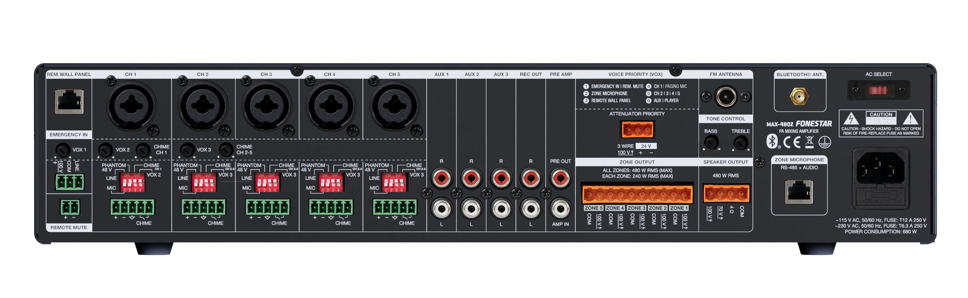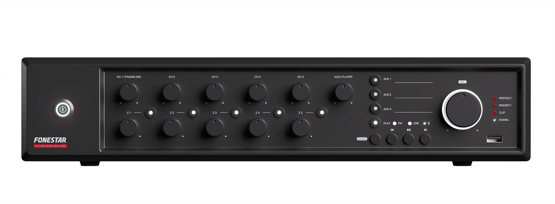 The Fonestar MAX-480Z is a high-power, multi-zone Public Address (PA) amplifier, ideal for professional installations requiring advanced sound control across multiple areas such as factories, sports facilities, and hospitality venues. It features a high-efficiency Class D amplifier design.