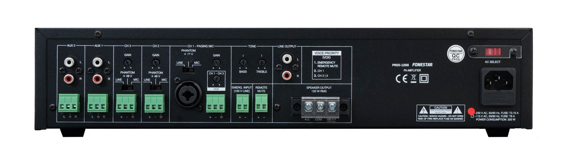 The Fonestar PROX-120S is a versatile Public Address (PA) amplifier engineered to provide reliable, distributed audio for single-zone installations over long periods. It is ideal for commercial establishments, educational centers, and hospitality venues that require robust sound coverage with a low-impedance or 100 V line speaker system.
