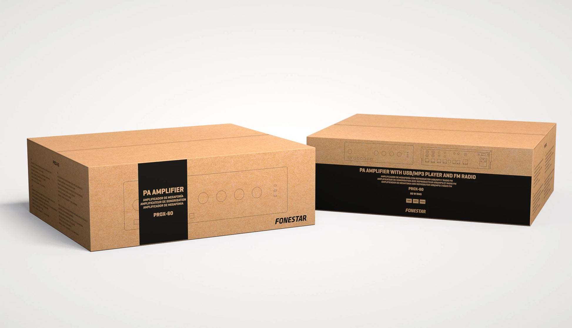 The Fonestar PROX-60 is a compact Public Address (PA) amplifier and mixer solution, integrating an amplifier, player, and mixer functions into a single unit. It is ideal for small, budget-friendly PA and background music installations that require high sound quality and intuitive operation using either 100 V line or low-impedance speakers.
