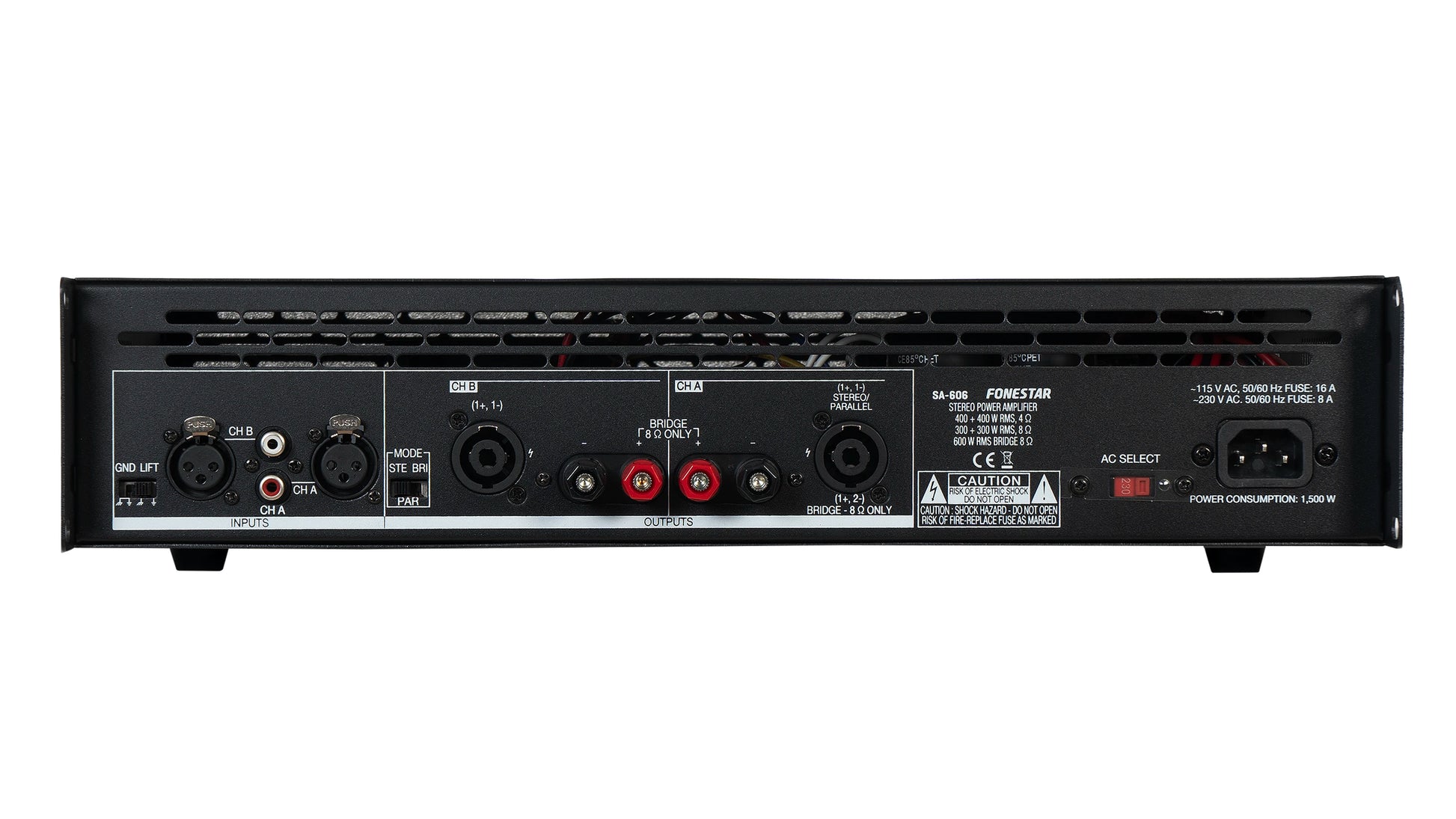 The Fonestar SA-606 is a professional stereo power amplifier from the SA series, distinguished by its high power output, excellent sound quality, and robust stability. It is designed for demanding high-power applications in both fixed installations (like auditoriums and pubs) and mobile setups (discos, concerts, and festivals).