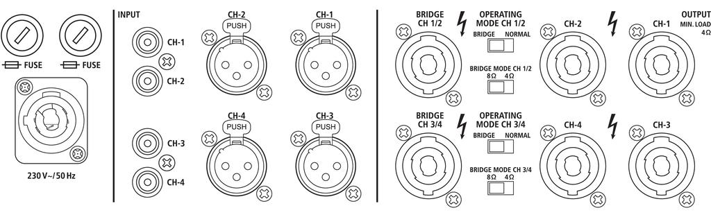 4 x 3-pole XLR 4 x RCA 4 x NEUTRIK SPEAKON 2 x NEUTRIK SPEAKON bridge |