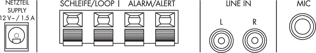 (phantom power: 7.2 V) 6.3 mm jack line: 48 mV/11 kΩ, 2 x RCA alarm: 2 terminals for connecting a switch |
