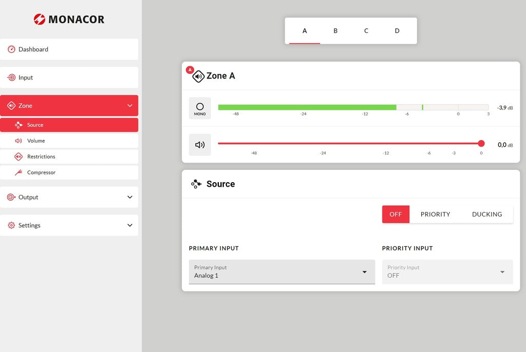 4-zone multifunctional mixing amplifier, class D technology with DSP and professional features for general multi-room PA applications. Clearly arranged graphical user interface HTML5 with extensive functions. Convenient operation via web browser regardless of the operating system used by the end-user device (PC, Mac, iOS, Android, etc.).