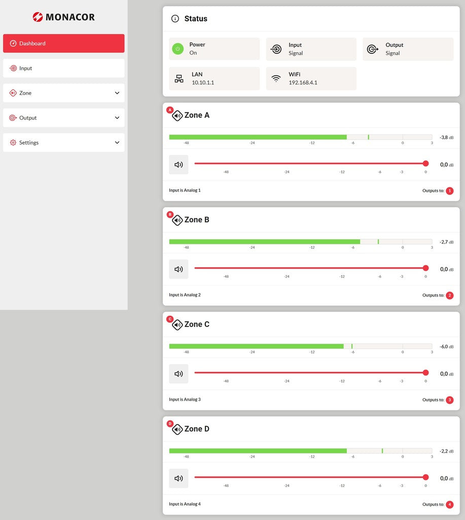 Dante®-enabled 4-zone multifunctional mixing amplifier class D technology with DSP and professional features for general multi-room PA applications.