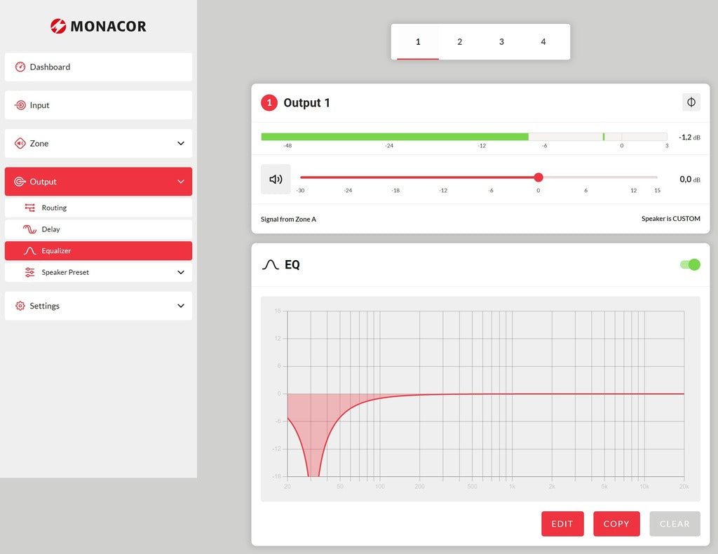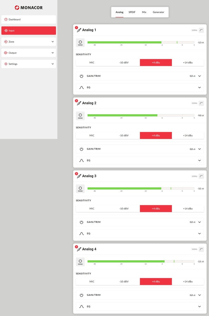 4 x 125 W per zone (4/8 Ω) or 2 x 250 W (100 V)