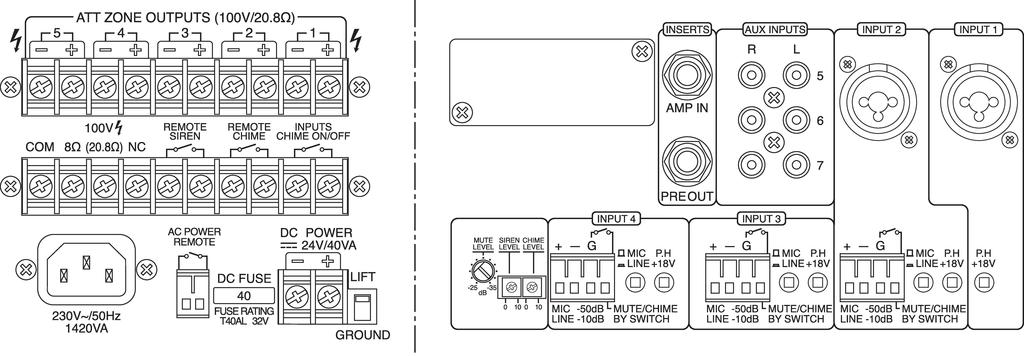1 x combo 6.3Â mm/XLR (mic/line), 3 x RCA L/R (line), 3 x plug-in terminals (line), 1 x 6.3 mm jack (preamplifier input), screw contacts (push-to-talk mic), screw contacts (zone paging mic), 1 x 6.3 mm jack (preamplifier output), screw contacts (chime button), screw contacts (speakers) |