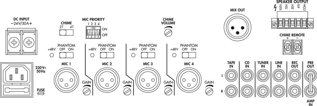 Comprehensive Inputs: Features 4 balanced microphone/line inputs (XLR) with selectable priority function, ensuring important announcements override other audio sources. It also includes 4 stereo line inputs (RCA) for connecting media players, tuners, or other auxiliary sources.