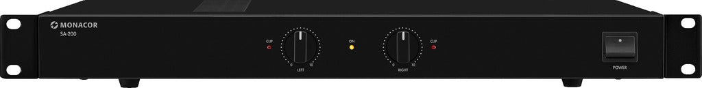 The Monacor SA-200 is a compact, robust, and versatile 100 W universal stereo amplifier designed for seamless integration into various audio setups, including professional rack-mounted systems.