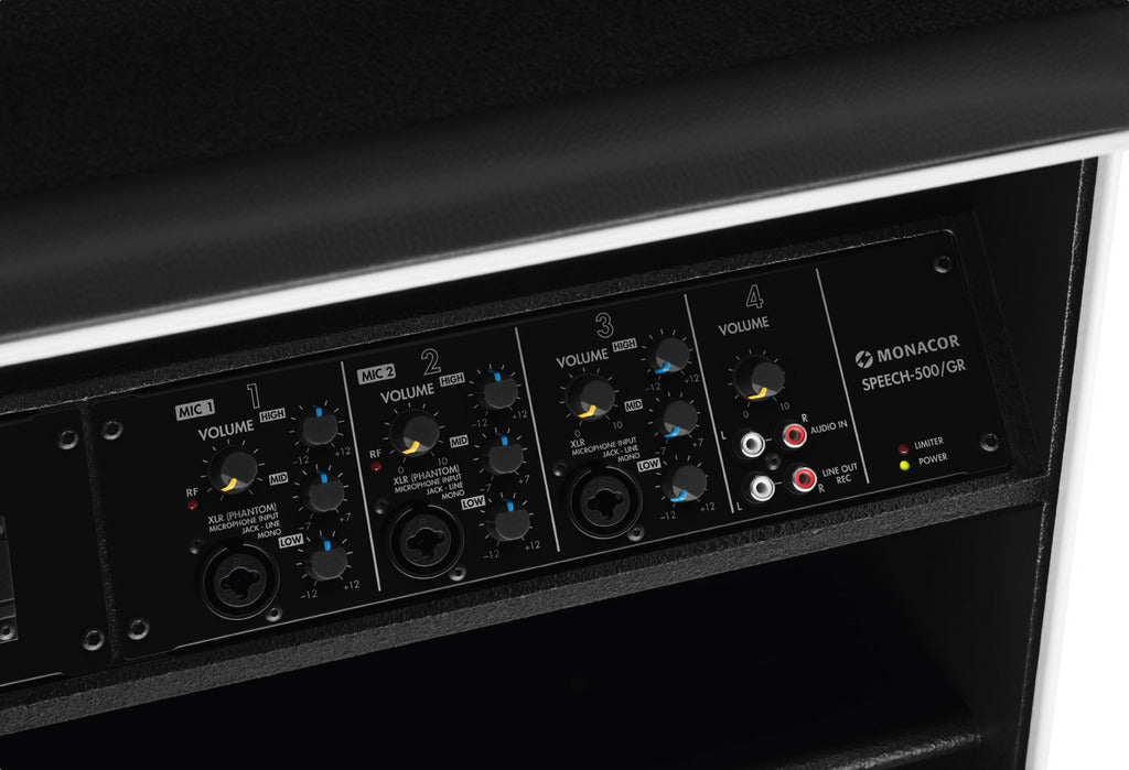 2 x Shock-absorbing XLR jacks on the top for optional gooseneck microphones (with 24 V Phantom Power).