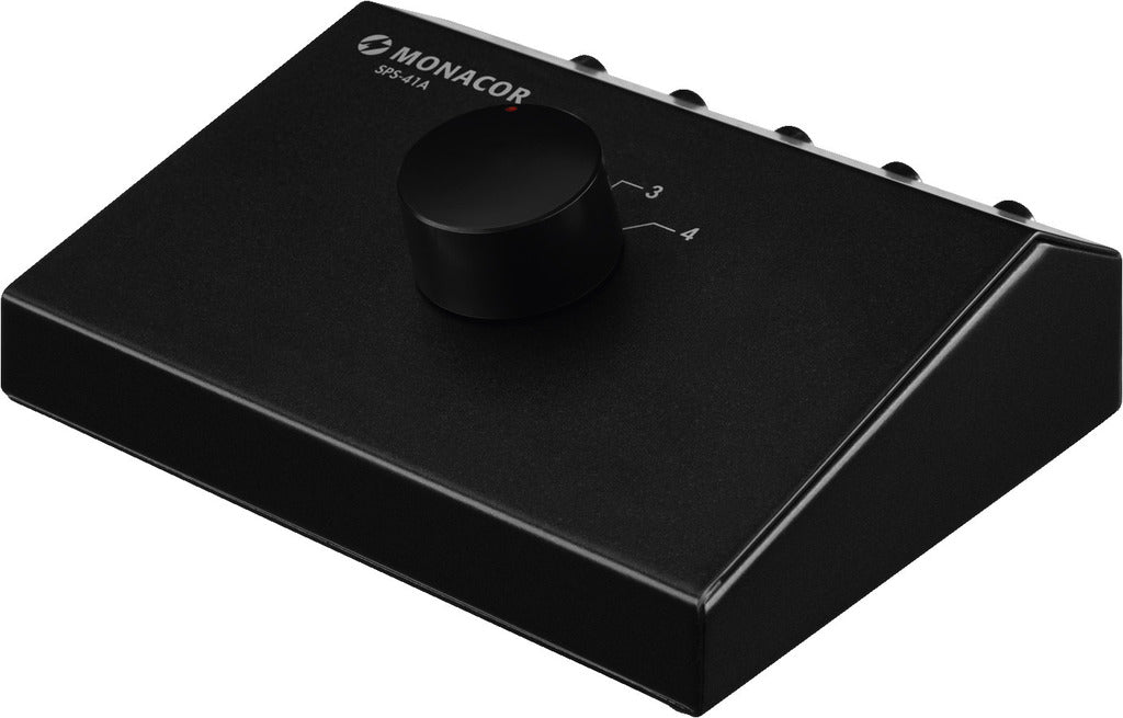 Stereo line switch box * 4 line sources to 1 amplifier line input * RCA inputs and RCA outputs * Metal housing * Dimensions: 126 x 58 x 108 mm * Weight: 335 g