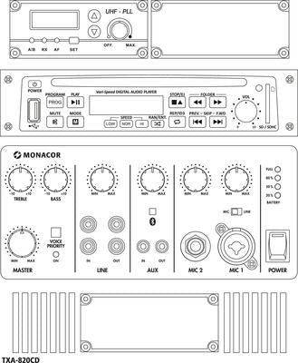 The MONACOR TXA-820CD is a highly mobile and versatile public address (PA) amplifier system, designed to deliver powerful, clear sound for a variety of mobile applications, including lectures, sales events, presentations, and more. Featuring an integrated media player and single-channel wireless capability, this all-in-one system provides professional sound with exceptional convenience.