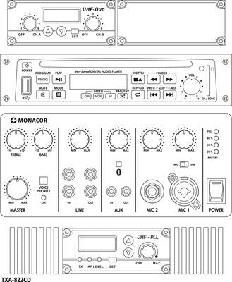 The MONACOR TXA-822CD is a robust, all-in-one portable amplifier system designed for flexible, high-quality public address (PA) applications—such as sales events, lectures, fitness classes, and outdoor presentations. Combining powerful amplification, dual-channel wireless readiness, and a comprehensive media player, the TXA-822CD offers professional sound with unparalleled mobility.