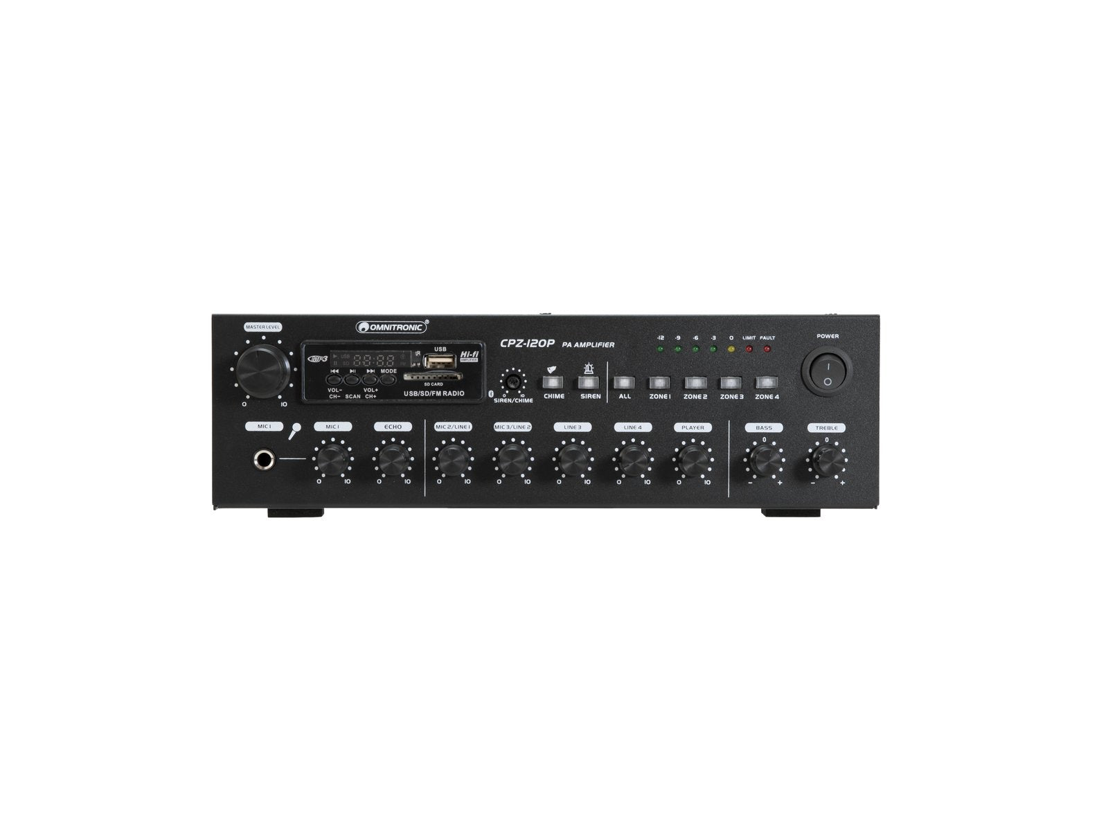 4-zone PA mono mixing amplifier, MP3 player, Bluetooth, zones switchable, 120 W