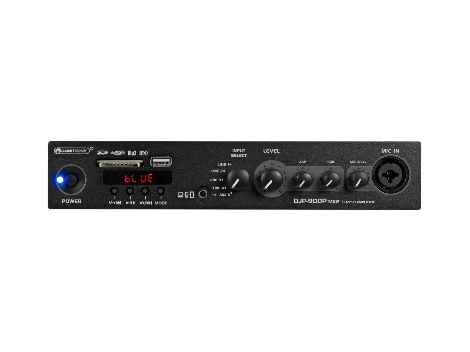 The OMNITRONIC DJP-900P MK2 is a compact stereo mixing amplifier with a built-in media player and Bluetooth connectivity, designed for permanent audio installations that require quick-access music playback and microphone mixing.