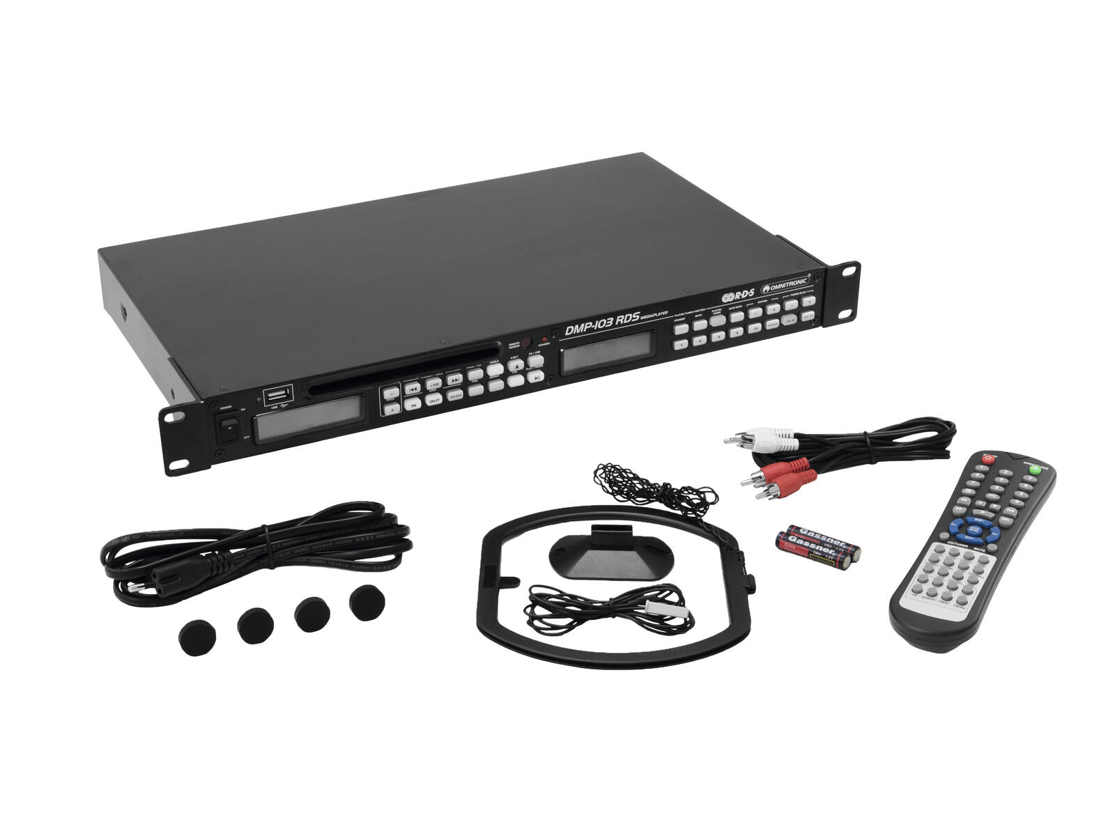 The OMNITRONIC DMP-103RDS is a professional, multi-source media player designed for permanent installation in commercial settings. Combining a CD/MP3 player, a USB port for digital media, and an FM RDS tuner, this 1 U rack-mount unit provides comprehensive audio playback options for venues like restaurants, bars, hotels, gyms, and retail stores.