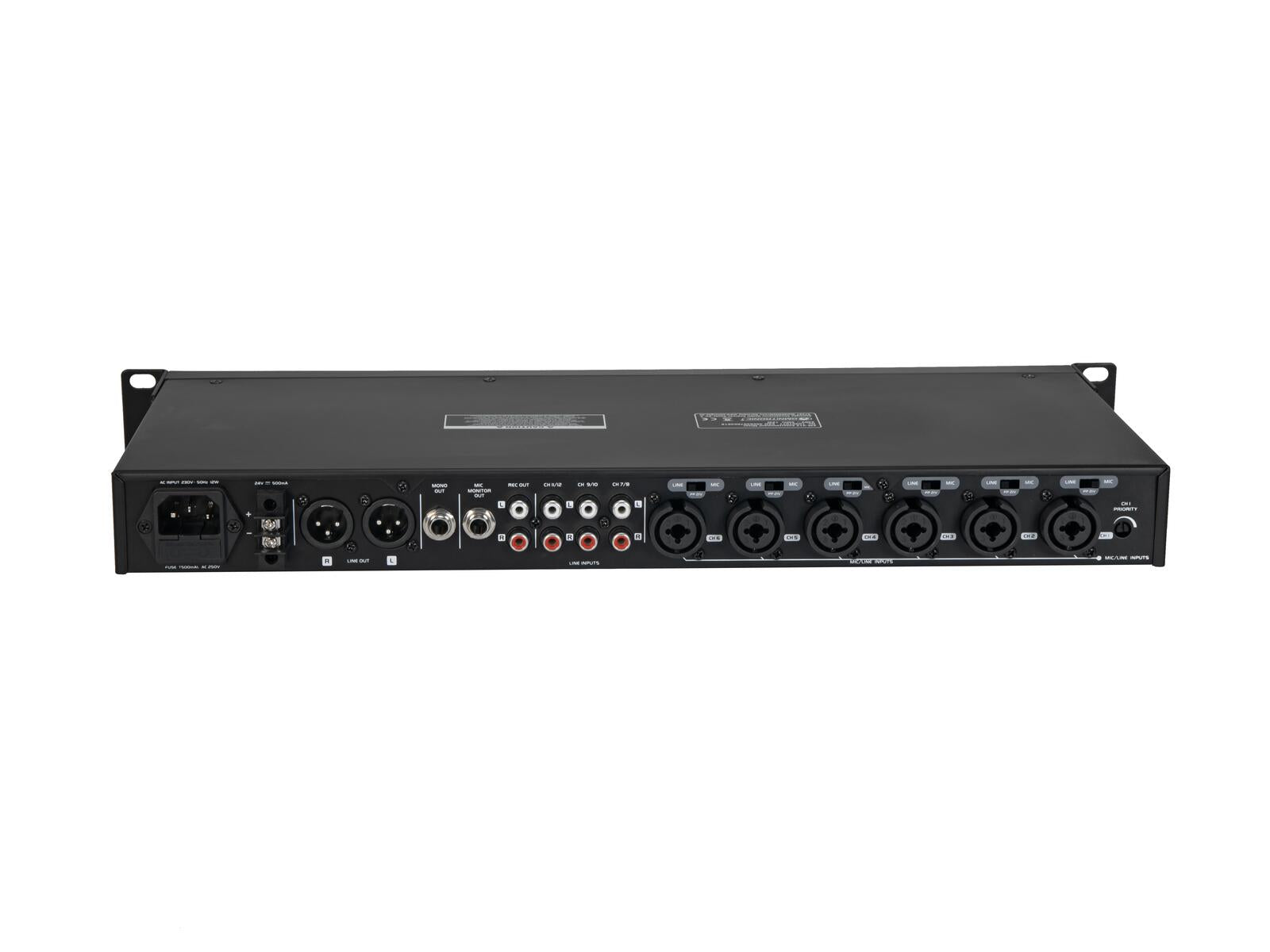Adjustable Priority Circuit: Features an adjustable priority (ducking) function specifically for microphone channel 1, which automatically lowers the volume of other signals when an announcement is made.