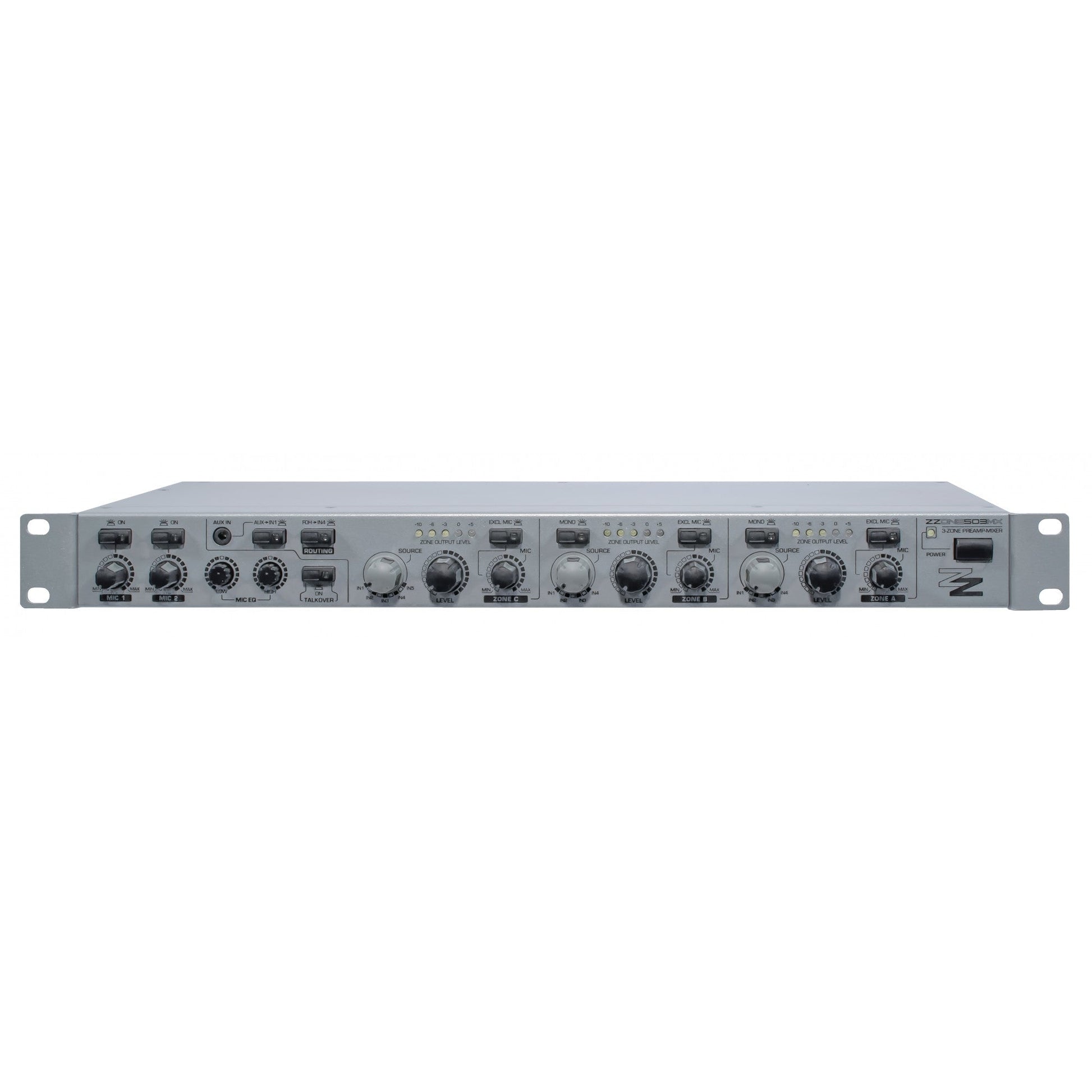The ZZONE503MX 3-Zone Preamp-Mixer is a preamplifier with 2 microphone inputs, 6 stereo inputs, adjustable talk-over and three balanced zone outputs, two in stereo and one in mono configuration.